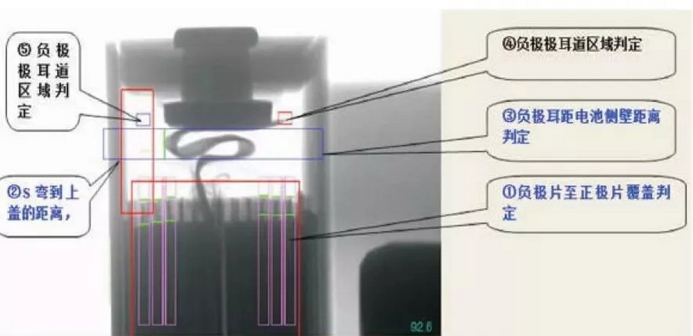 ▲鋁殼電池頭部極耳內(nèi)部結(jié)構(gòu)和正負(fù)極片對(duì)齊度檢測(cè)