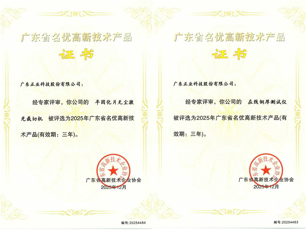 近日,廣東省高新技術(shù)企業(yè)協(xié)會正式公布了2025年第二批廣東省名優(yōu)高新技術(shù)產(chǎn)品評選結(jié)果。廣東正業(yè)科技股份有限公司憑借自主研發(fā)的“半固化片無塵激光裁切機(jī)”和“在線銅厚測試儀”兩款高性能設(shè)備,成功入選“廣東省名優(yōu)高新技術(shù)產(chǎn)品”名單,彰顯了公司在高新技術(shù)產(chǎn)品研發(fā)與制造領(lǐng)域的實(shí)力。