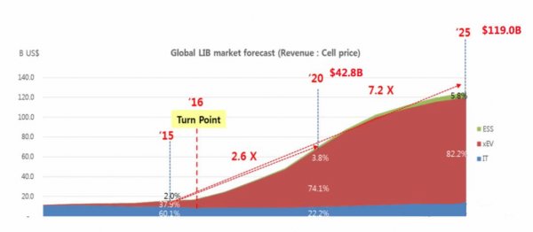 據SNE的預測截止2025年,全球動力電池市場需求將達到 1243GWh,產值將達到 979 億美元,動力電池的市場份額將占據整個鋰離子電池市場份額的82.2%左右,將對鋰離子電池行業產生決定性的影響。